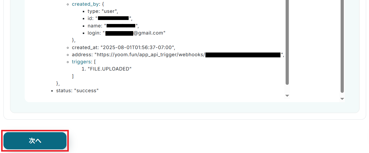 Boxのフォルダにファイルがアップロードされたら、Gmailにメールを送付するフローです。