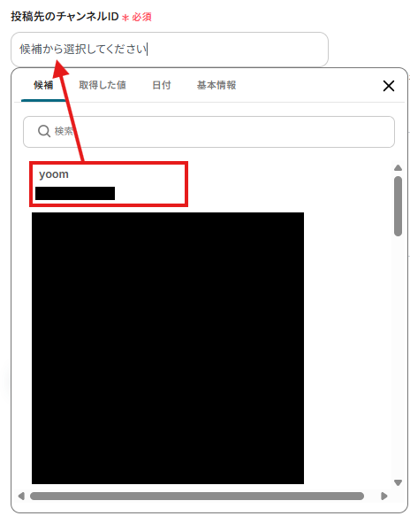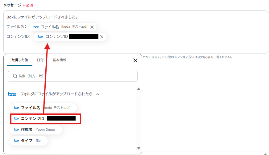 - メッセージ:Slackに投稿する文章を設定できます。画像のように前のステップで取得したファイル名やコンテンツIDなどを文章に含めることも可能です。