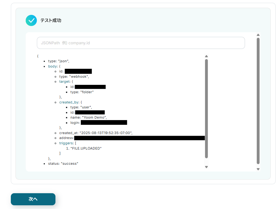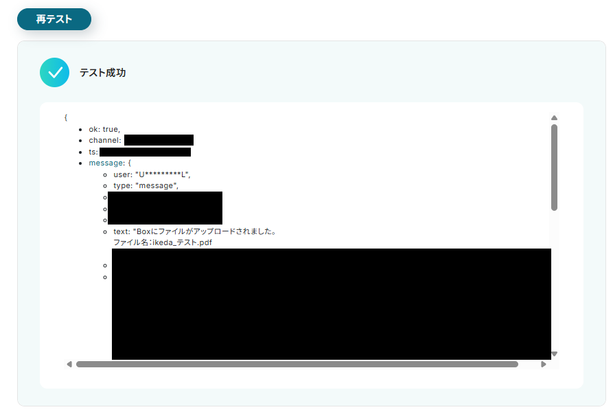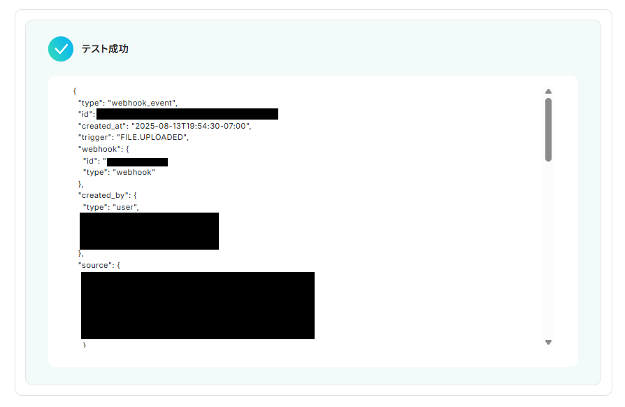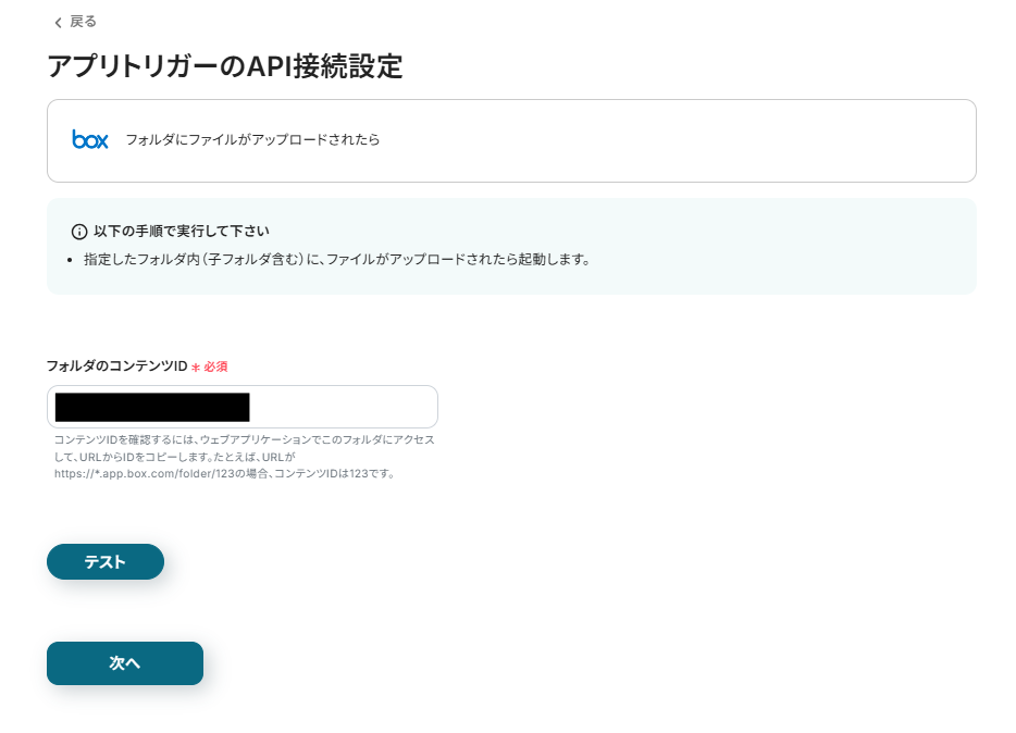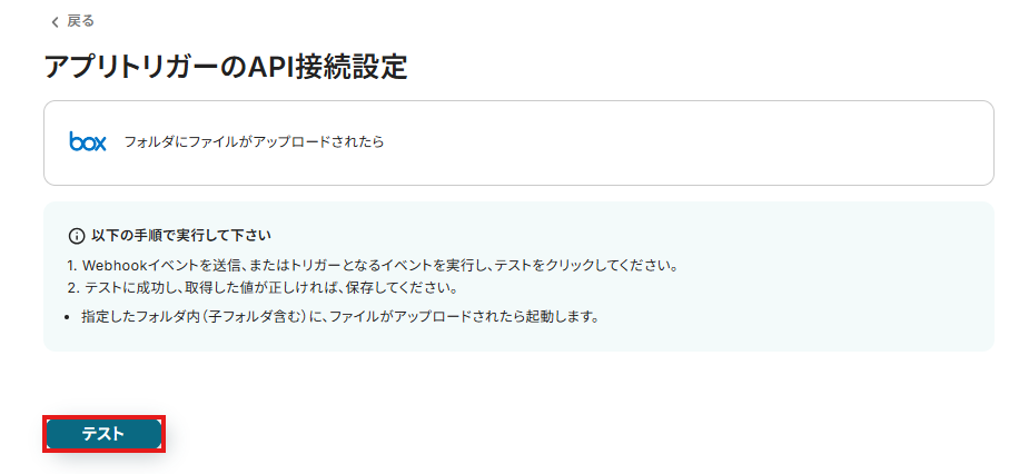 Boxへファイルの格納が完了したら、「アプリトリガーのAPI接続設定」画面でテストボタンをクリックしましょう。