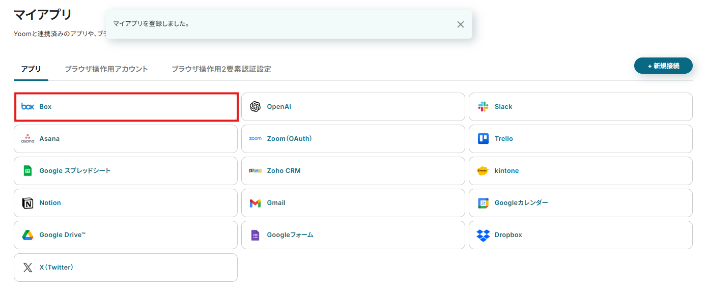 - アプリ:マイアプリ連携をした「Box」が反映されていることを確認しましょう。