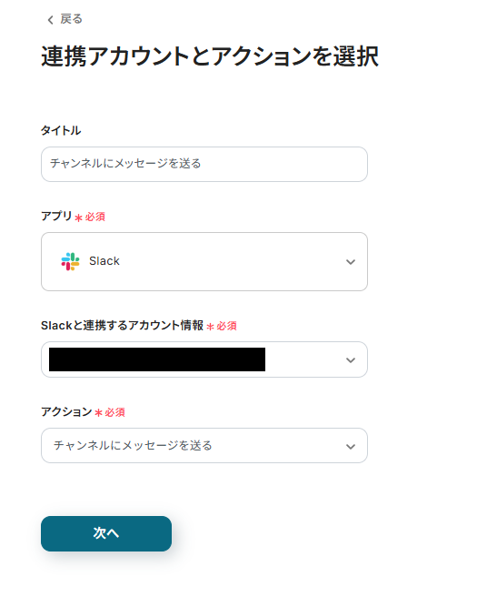 「連携アカウントとアクションを選択」画面では以下を設定します。