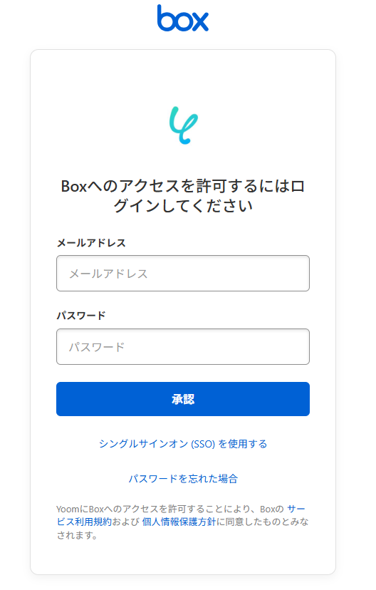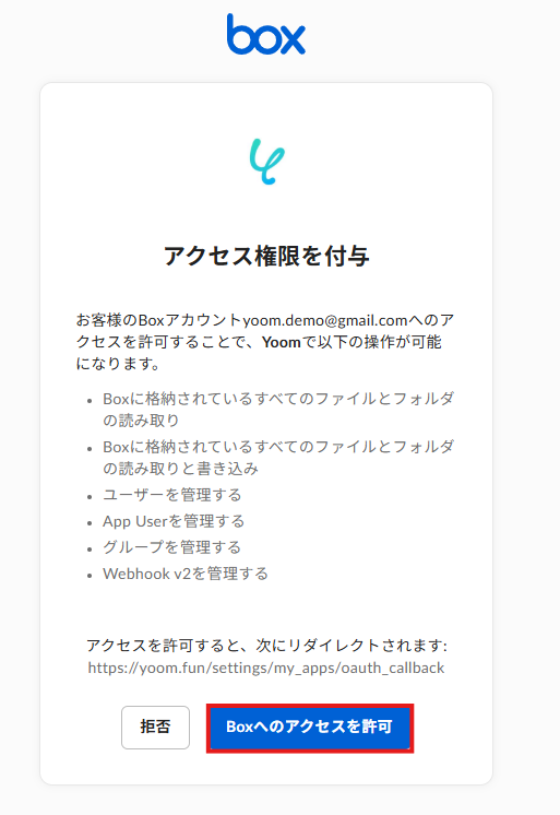 アクセス権限の付与が求められたら、「Boxへのアクセスを許可」のボタンをクリックしましょう。
