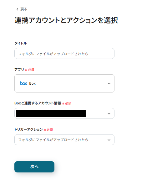 - Boxと連携するアカウント情報:フローと紐づけるアカウントを選択してください。対象のアカウントがリストに表示されていないときは「アカウントを追加」から追加が可能です。