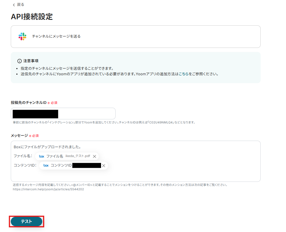 Yoomの注意書きを参考に「フォルダのコンテンツID」を入力し、テストボタンをクリックしましょう。