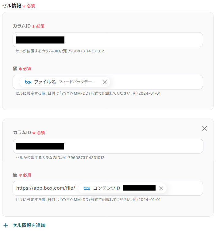 セルに反映させたい情報の数だけ、カムラIDと値を入力してください。(ページ最下部の「セル情報を追加」を押せば、入力欄を増やすことが出来ます)