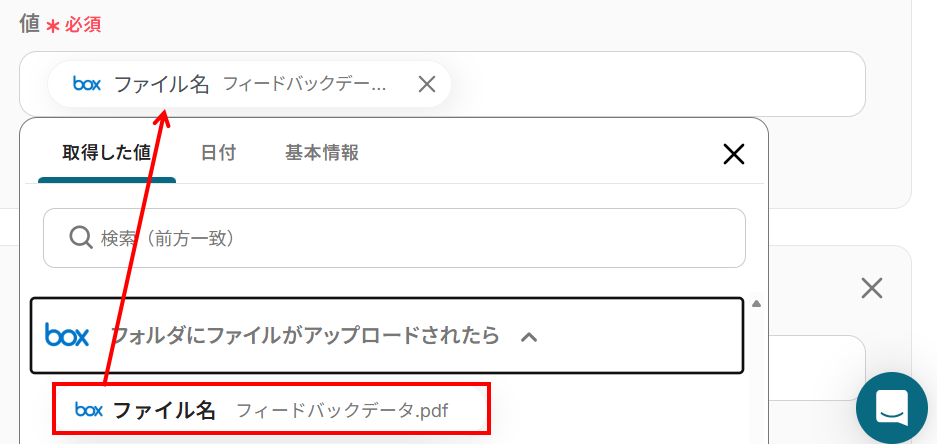 - 値:入力欄を選択し、前のステップで取得したアウトプットを選びましょう。