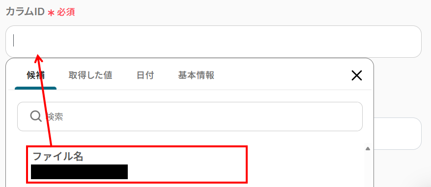 - カラムID:こちらも入力欄をクリックし、候補からデータを反映させたいカラムを選びましょう。