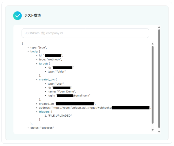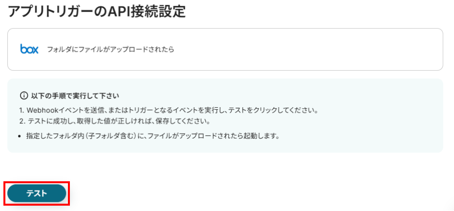 「アプリトリガーのAPI接続設定」の画面になるので、指定したBoxフォルダに接続できるか確認してみましょう。