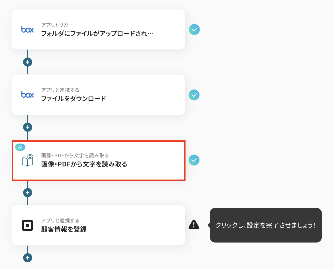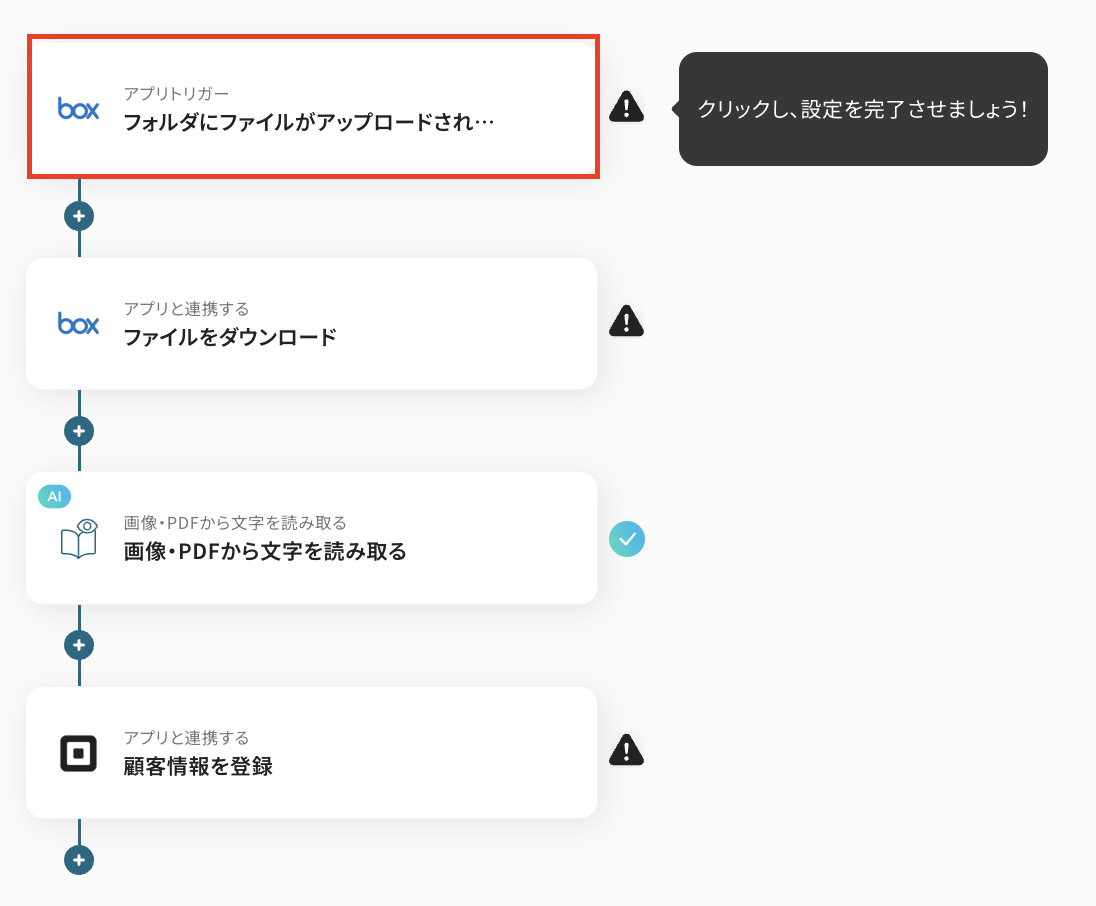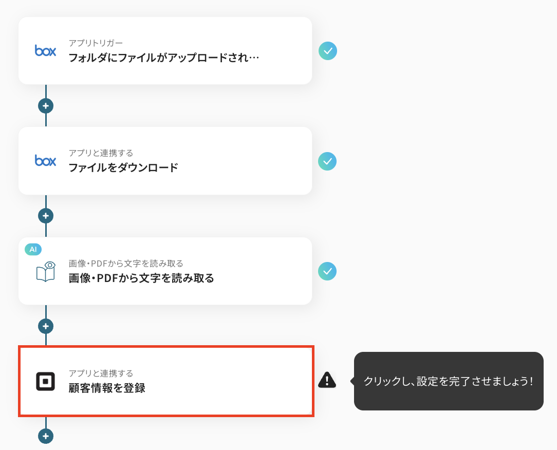 Boxに契約書や申込書といった顧客情報を含むファイルがアップロードされた際に、そのファイル内容からAIが自動で顧客情報を抽出し、Squareに新規顧客として登録するフローです。