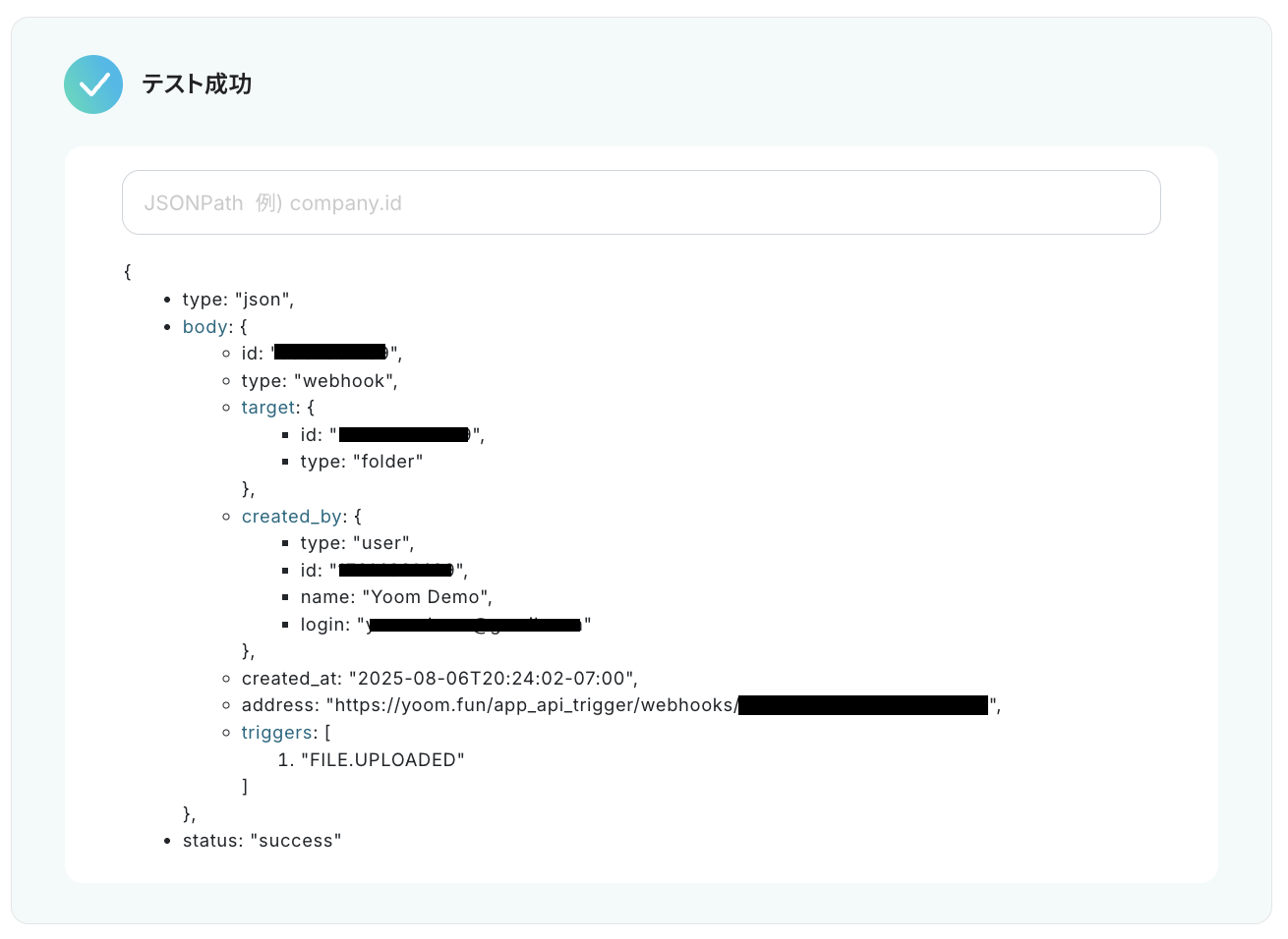 設定が完了したら、指定のBoxフォルダとYoomの連携チェックを行います。