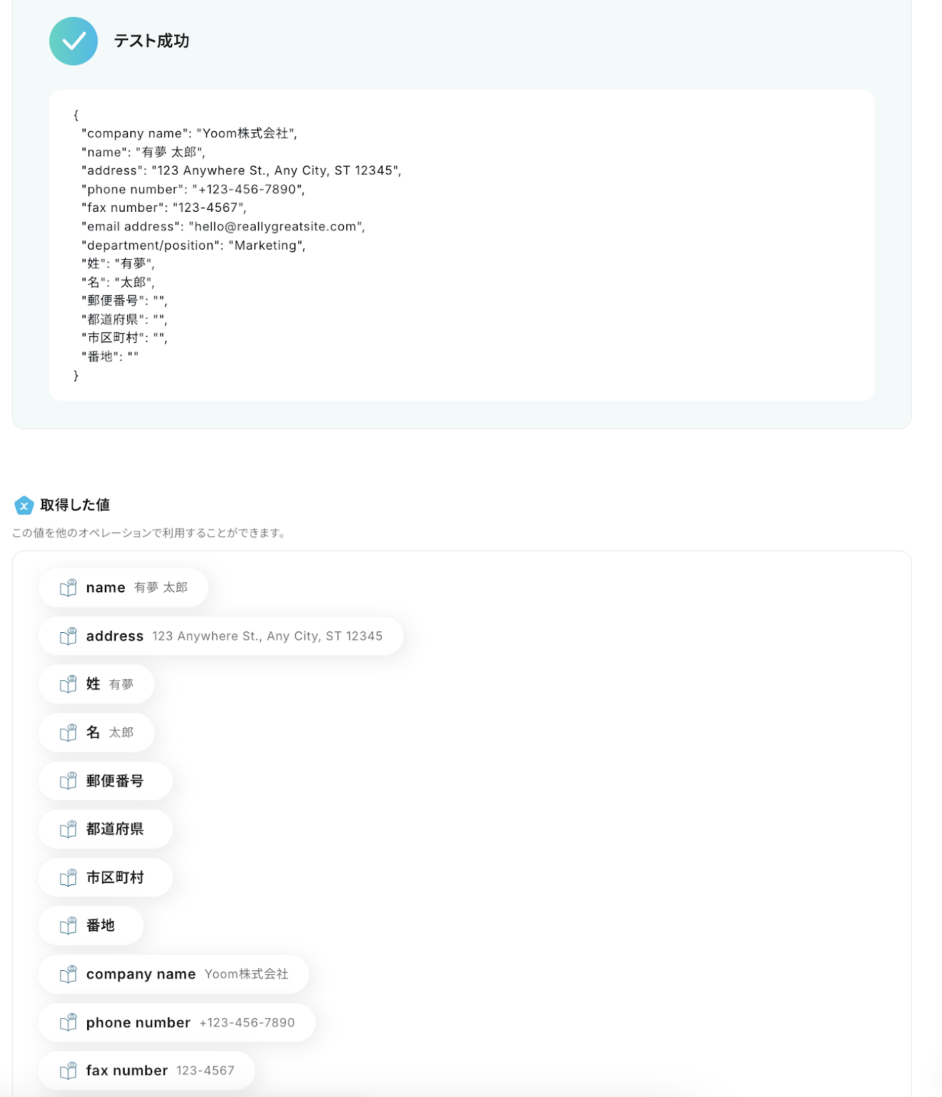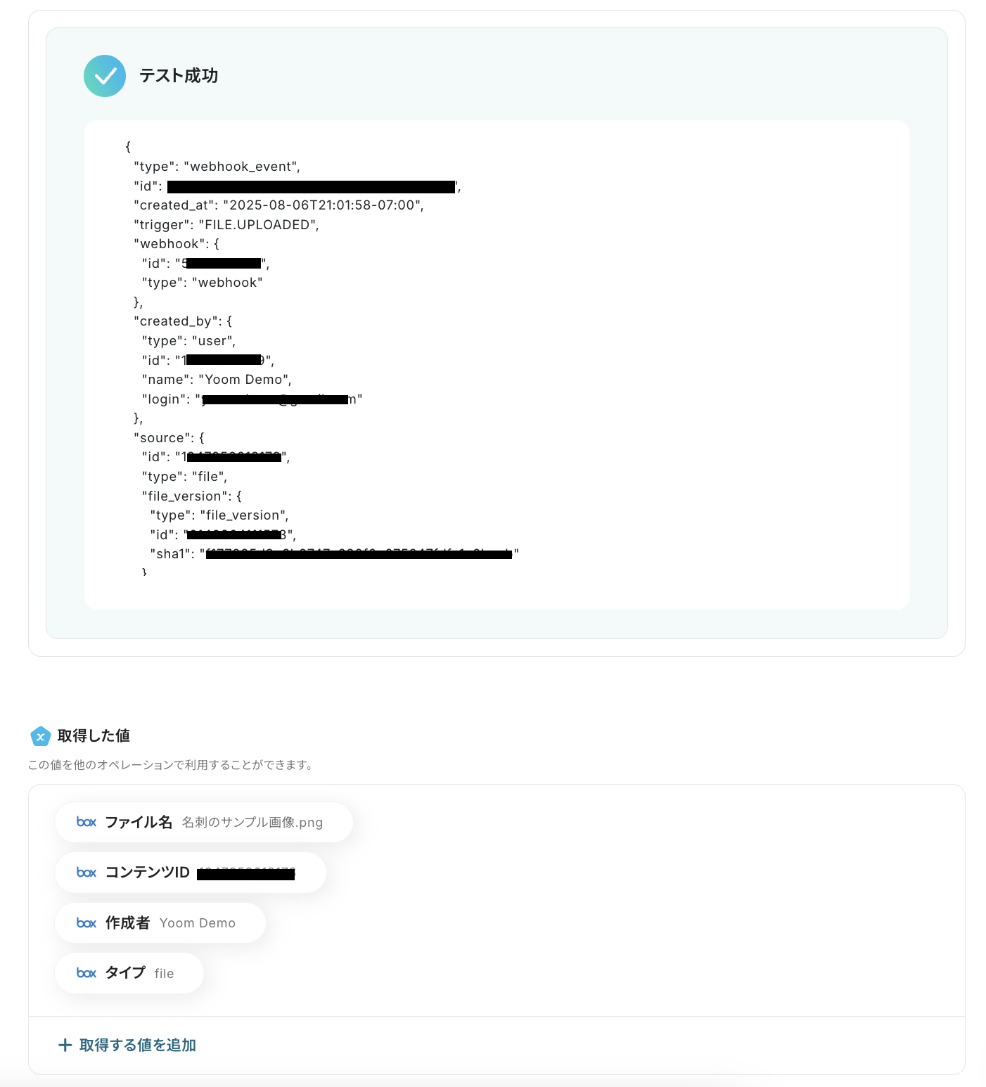 テストが成功すると、先ほどアップロードしたファイルの情報が「取得した値」にアウトプットとして抽出されるので、内容を確認しましょう。