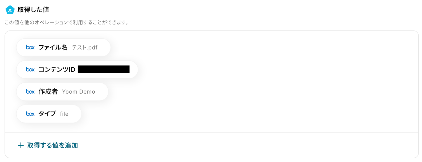 A:はい、ファイルURLや作成者情報も連携可能です。ただし、Boxの「ファイル情報を取得」アクションだけではURLは取得できません。Boxの仕様上、ファイルをアップロードしただけでは共有リンクが存在しないためです。