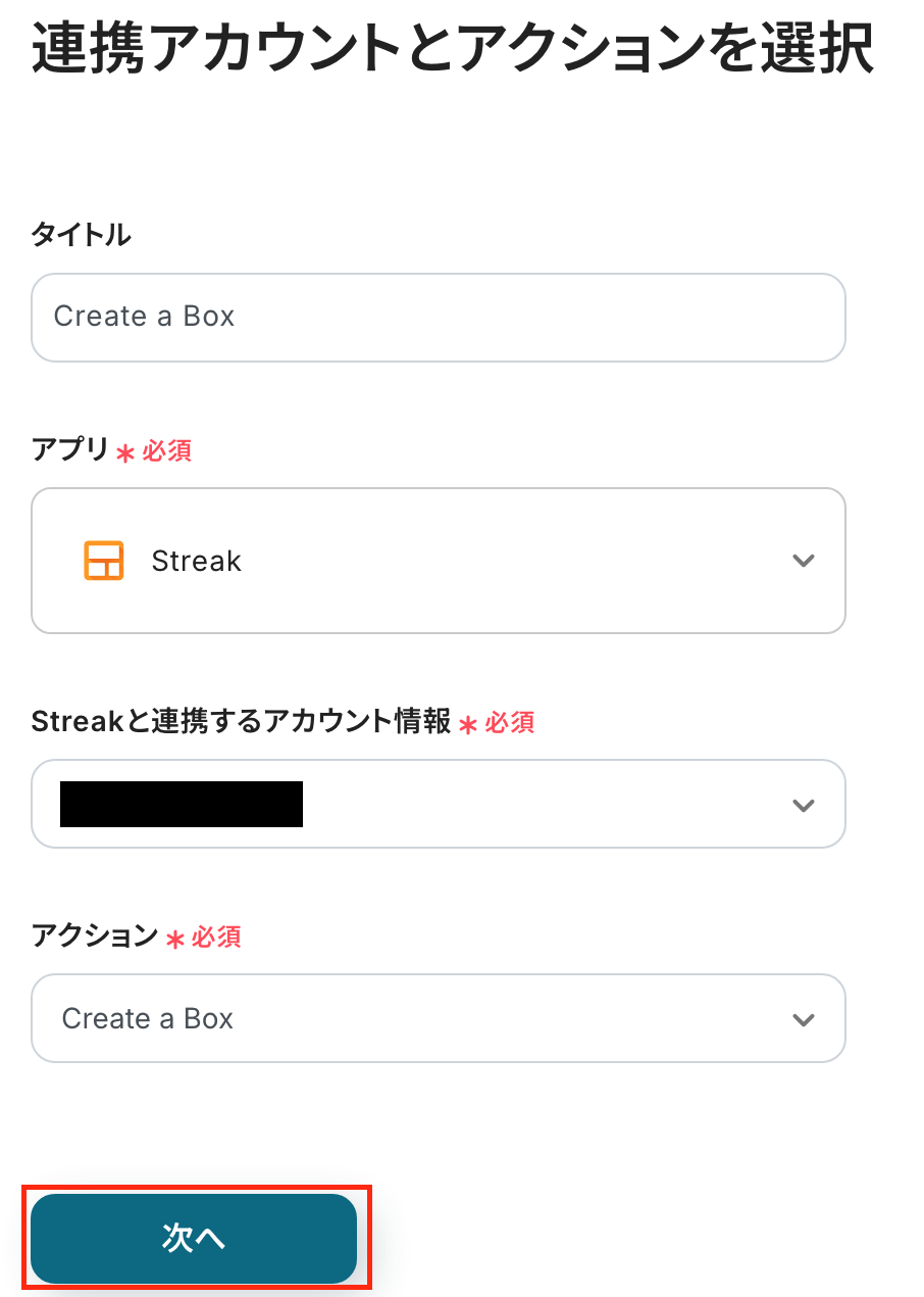 タイトルを任意で修正し、連携するアカウント情報を確認します。アクションはそのままで、「次へ」をクリックしましょう!