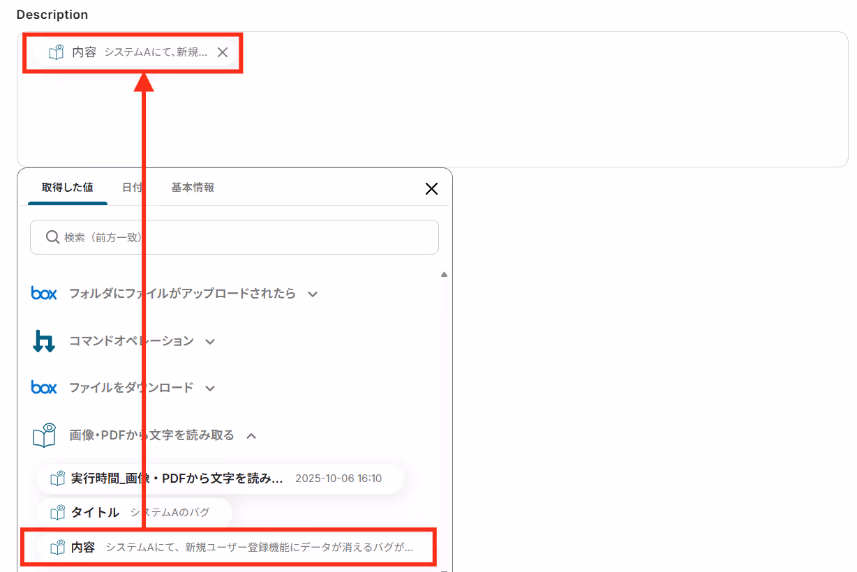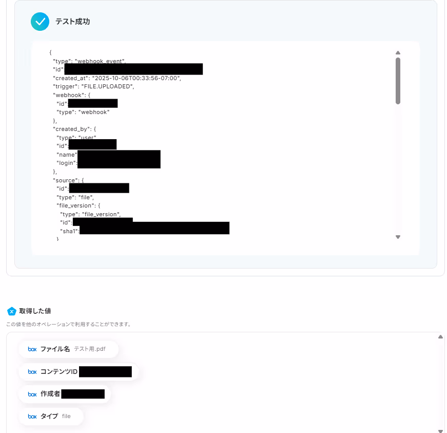 「取得した値」は変数となるので、Boxの指定したフォルダにファイルがアップロードされる度にコンテンツIDのデータを活用可能になります!