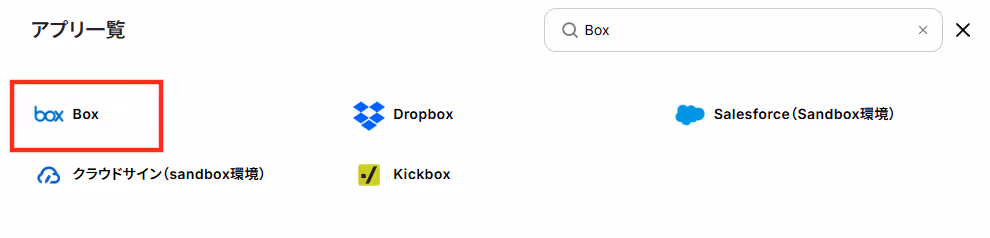 検索窓にBoxと入力し、表示された候補からBoxをクリックしましょう。