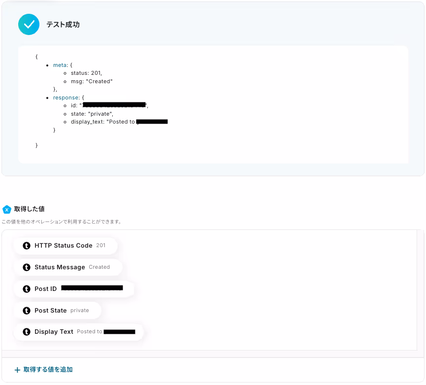 テストに成功すると、以下のように「取得した値」が表示されます。