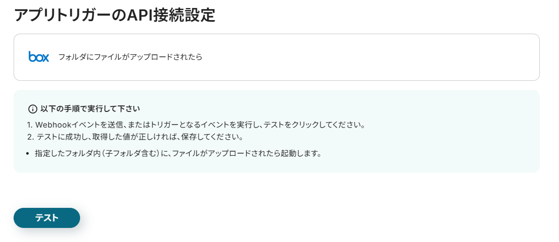 アプリトリガーのAPI接続設定の画面が表示されるので、Boxに実際にファイルをアップロード後、「テスト」をクリックましょう。