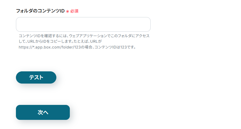 フォルダのコンテンツIDをBoxで確認し、「テスト」をクリックしましょう。
