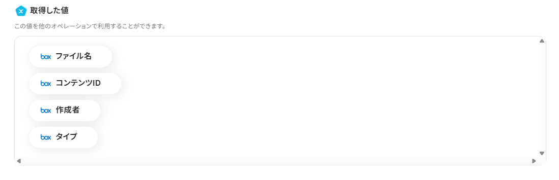 テストを行うと以下の「取得した値」に、Boxから取得した情報が表示されます。(実際の設定では表示されている想定です。)この後、この取得した値の内容を入力に使用することができます。