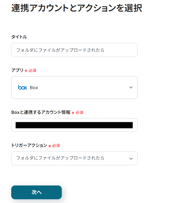 連携アカウントとアクションを選択する画面が表示されるので、今回連携するBoxのアカウントを確認し「次へ」をクリックします。
