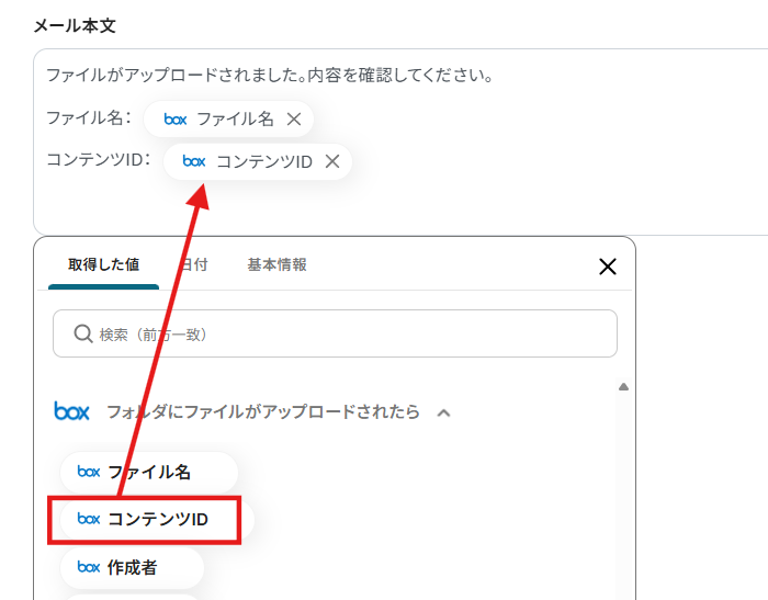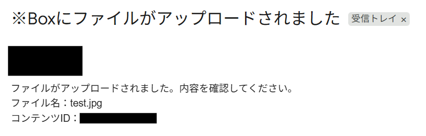 メール本文は、以下のように取得した値を使用することで、簡単にBoxにアップロードされたファイルの情報を入力することが可能です。