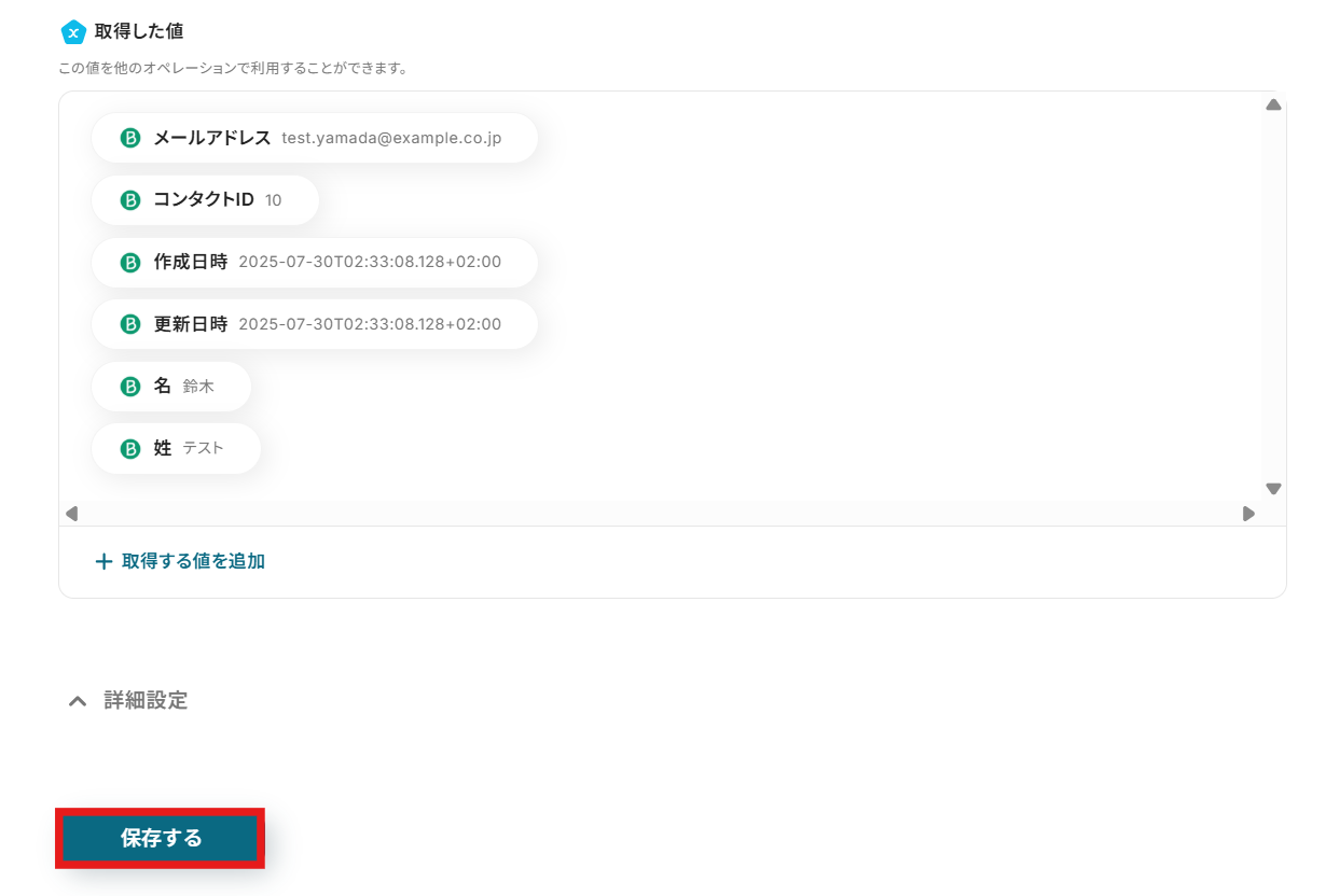 テストが成功すると、「テスト成功」という画面が表示され、Brevoから取得した情報を引用できるようになります。