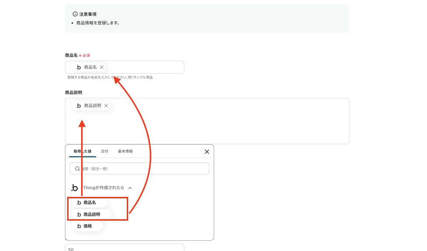 入力バーをクリックすると、前ステップで取得したアウトプットを引用できます。