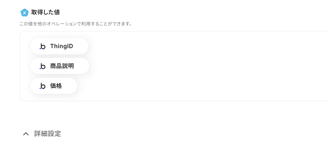 アウトプット情報は、「この値を他のオペレーションで利用することができます。」という注釈の通り、この後のステップで引用・活用できます。