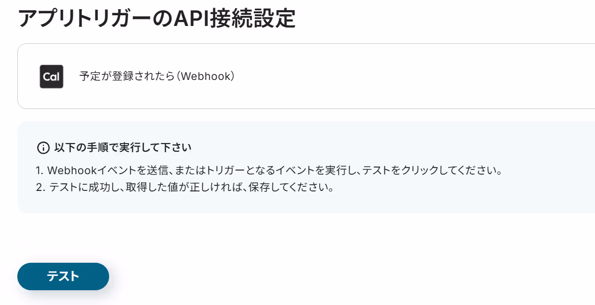 ここでテスト用にCal.comから、トリガーイベントとなる予定を登録してください。