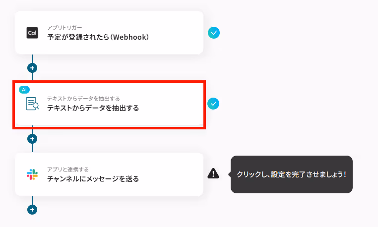 この時、「←Cal.comのアウトプットを設定してください」「←テキスト抽出のアウトプットを設定してください」というテキストはそれぞれ削除しましょう。