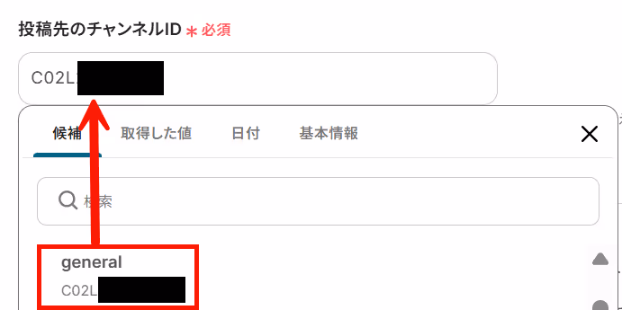 投稿先のチャンネルIDのフィールドをクリックし、候補から連携したいチャンネルIDを選択します。