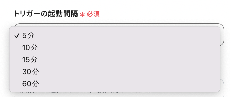 ・トリガーは5分、10分、15分、30分、60分の間隔で起動間隔を選択できます。