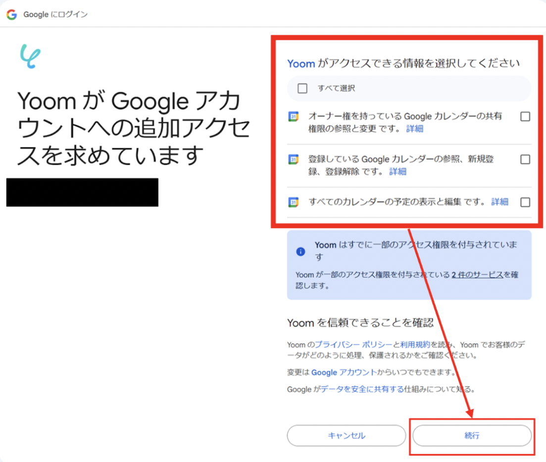 Yoomがアクセスできる範囲を選択して「続行」をクリックすると連携完了です!