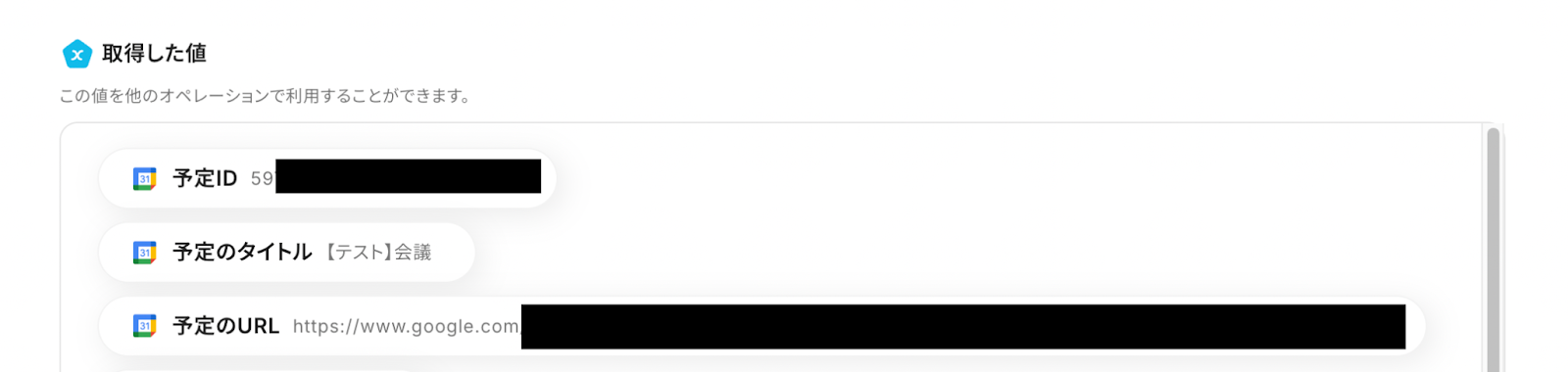 テストに成功すると「取得した値」としてGoogleカレンダーのデータがアウトプットされます。