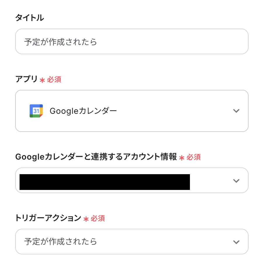 「トリガーアクション」:デフォルトで「予定が作成されたら」が選択されているので、変更しないでOKです!