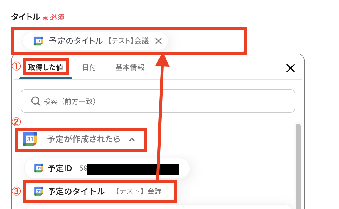取得した値を埋め込むことでGoogleカレンダーのデータが反映されるので、後々検索する際に効率的です。また、タスクのタイトル重複を防ぎ、固定値ではなく、トリガーが実行されるたびに最新の情報が反映できます。