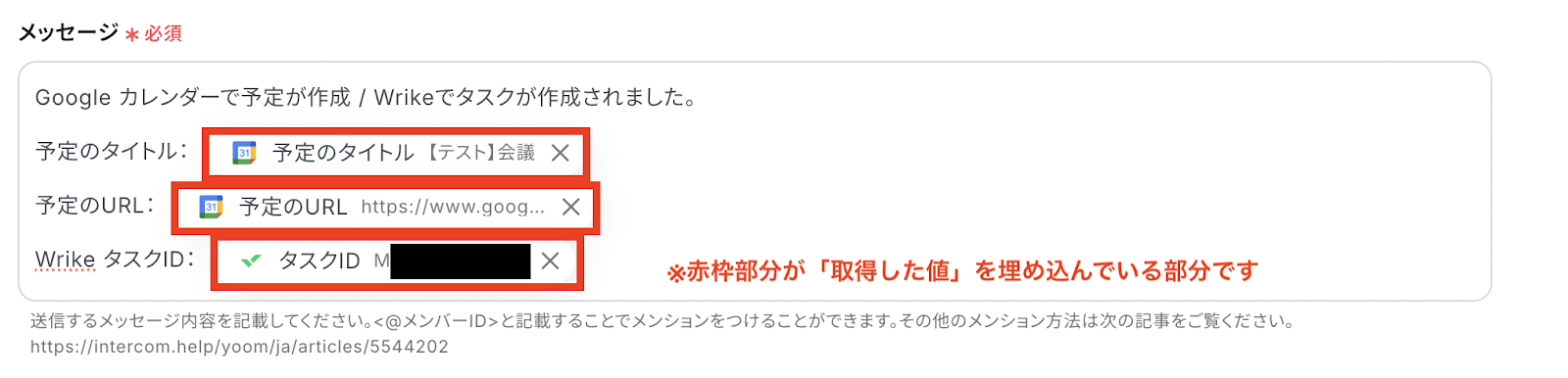 「メッセージ」内容は、取得した値や固定値を組み合わせて設定しましょう。