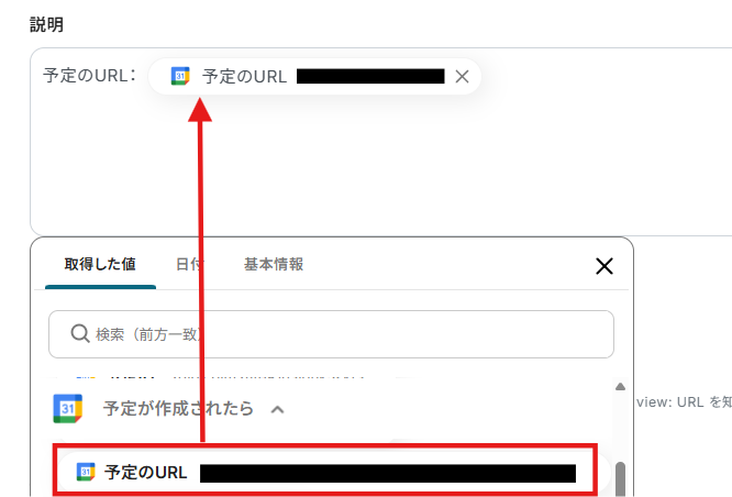 説明には取得した値から、「予定のURL」を入力しました。 取得した値を活用することで、固定値ではなく、トリガーが実行されるたびに最新情報の反映ができます。
