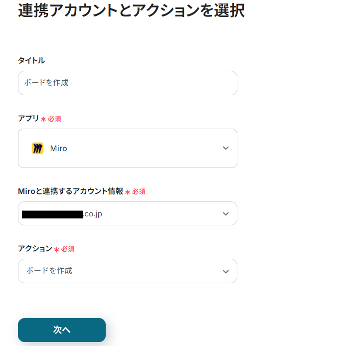 先ほどと同様に連携アカウントとアクションを選択する画面が表示されるので、今回連携するMiroのアカウントを確認し「次へ」をクリックします。