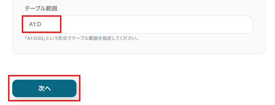 更新したいデータが記載されているテーブル範囲を任意で入力し、「次へ」をクリックします。