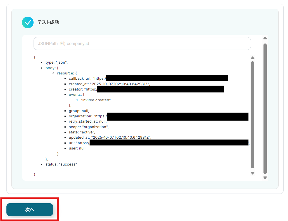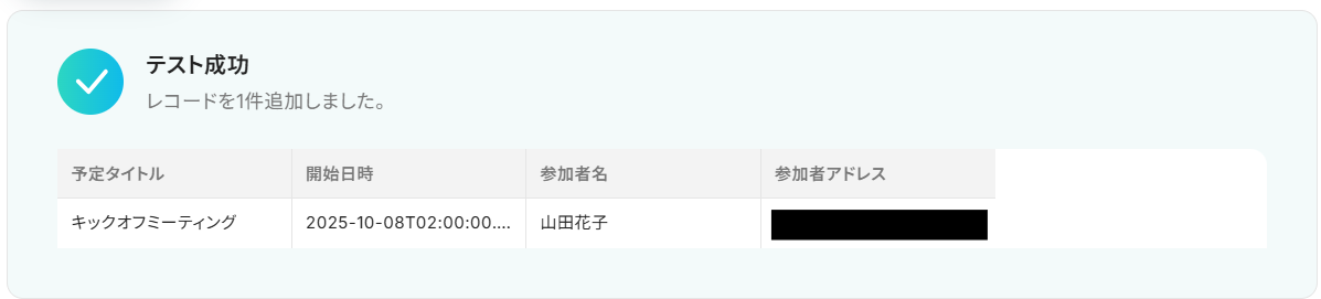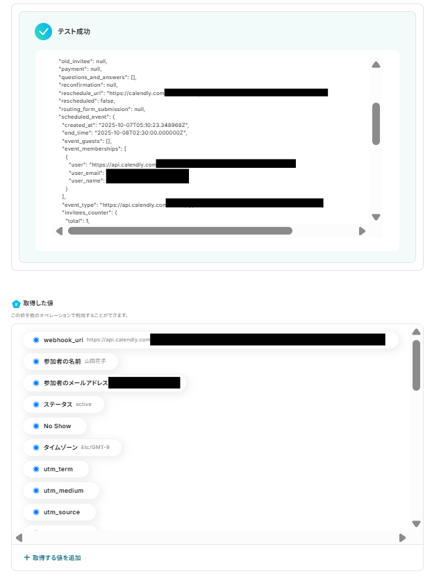 テストに成功すると、取得した値の各項目の横に 、Calendlyで登録した予定の詳細情報が表示されます。