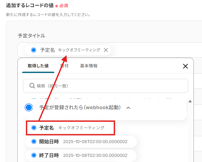 編集欄をクリックし、「予定が登録されたら(webhook起動)」から各項目に対応する項目を選択します。