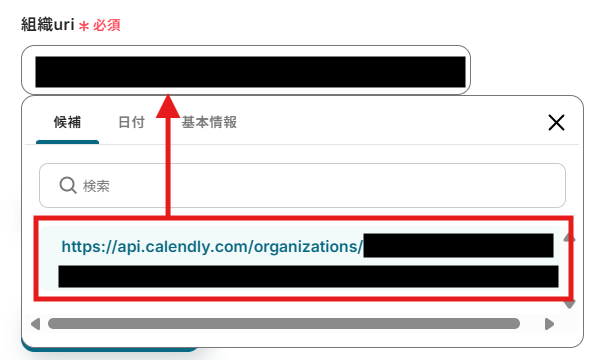 編集欄をクリックすると、連携したCalendlyアカウントの組織uri候補が表示されます。