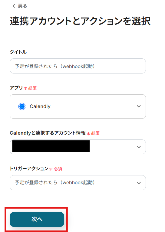 トリガーアクションは、「予定が登録されたら(webhook起動)」のままで次に進みましょう!