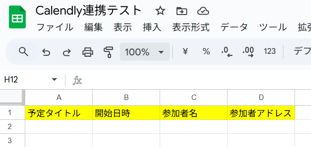 Calendlyと連携するGoogle スプレッドシートをまだ作成していない方は、ここで作成しましょう! Calendlyで作成したタスク情報が反映されるよう、下記を参考にGoogle スプレッドシートを適切に設定してください。 ヘッダーの下に該当する情報が自動で追加されていくイメージです!