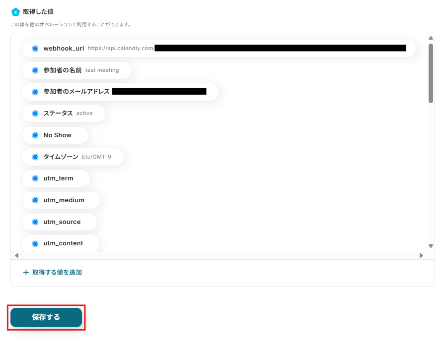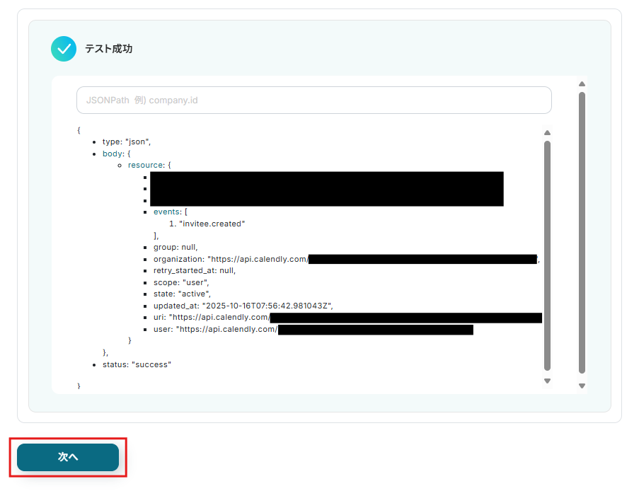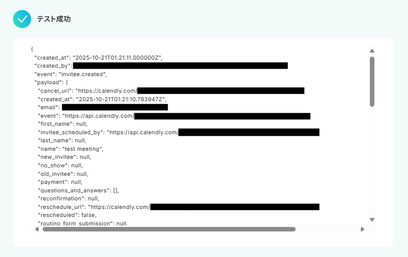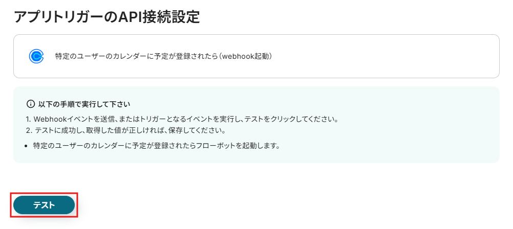 Calendlyの設定ができたので、「テスト」をクリックして実行します。