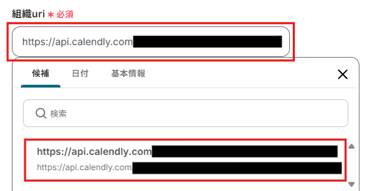 - 組織uri / ユーザーuri:入力欄をクリックすると以下のように候補が表示されるので、該当するものを選択してください。