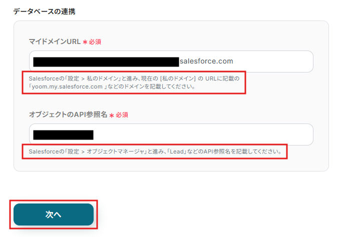 - データベースの連携:赤枠内の説明に従って、SalesforceのページからマイドメインURLとオブジェクトのAPI参照名を入力してください。