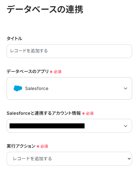 - タイトル / データベースのアプリ / Salesforceと連携するアカウント情報 / 実行アクション:ステップ3と同じ要領で、各項目を設定します。