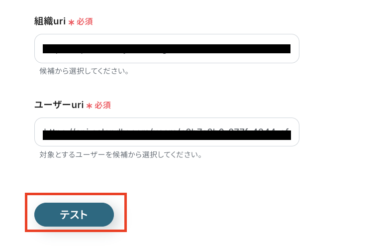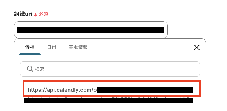「組織uri」を、入力欄をクリックして表示される候補の中から、フローで使用するものを選択してください。